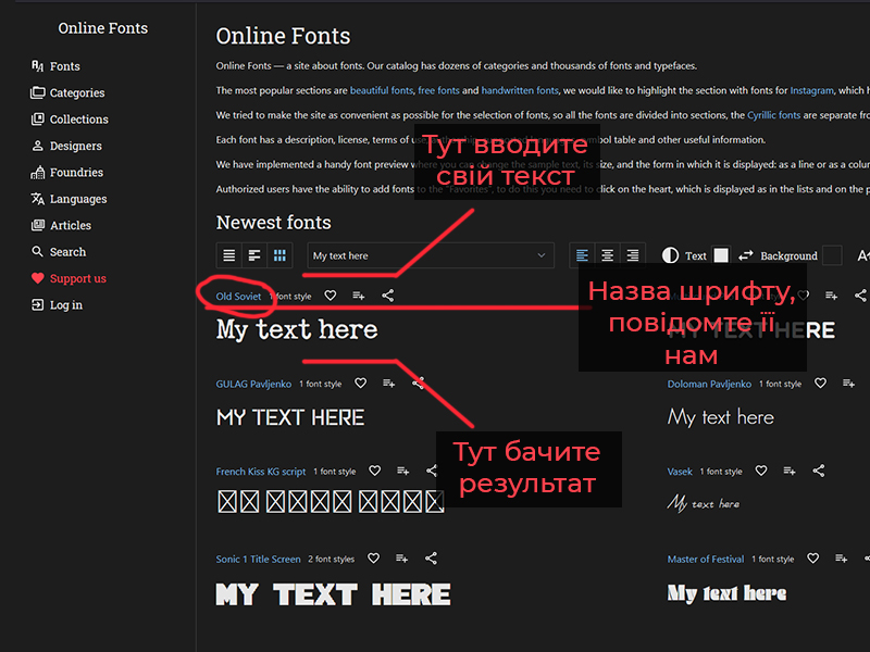 Спочатку необхідно визначитись з тим, що ви будете замовляти. Це напис? Тоді необхідно обрати шрифт, тицьнувши на кнопку нижче. Там ви зможете ввести світ текст і подивитись як буде виглядати напис. Для зручності нижче буде додана коротенька ілюстрована інструкція з користування цим сайтом.