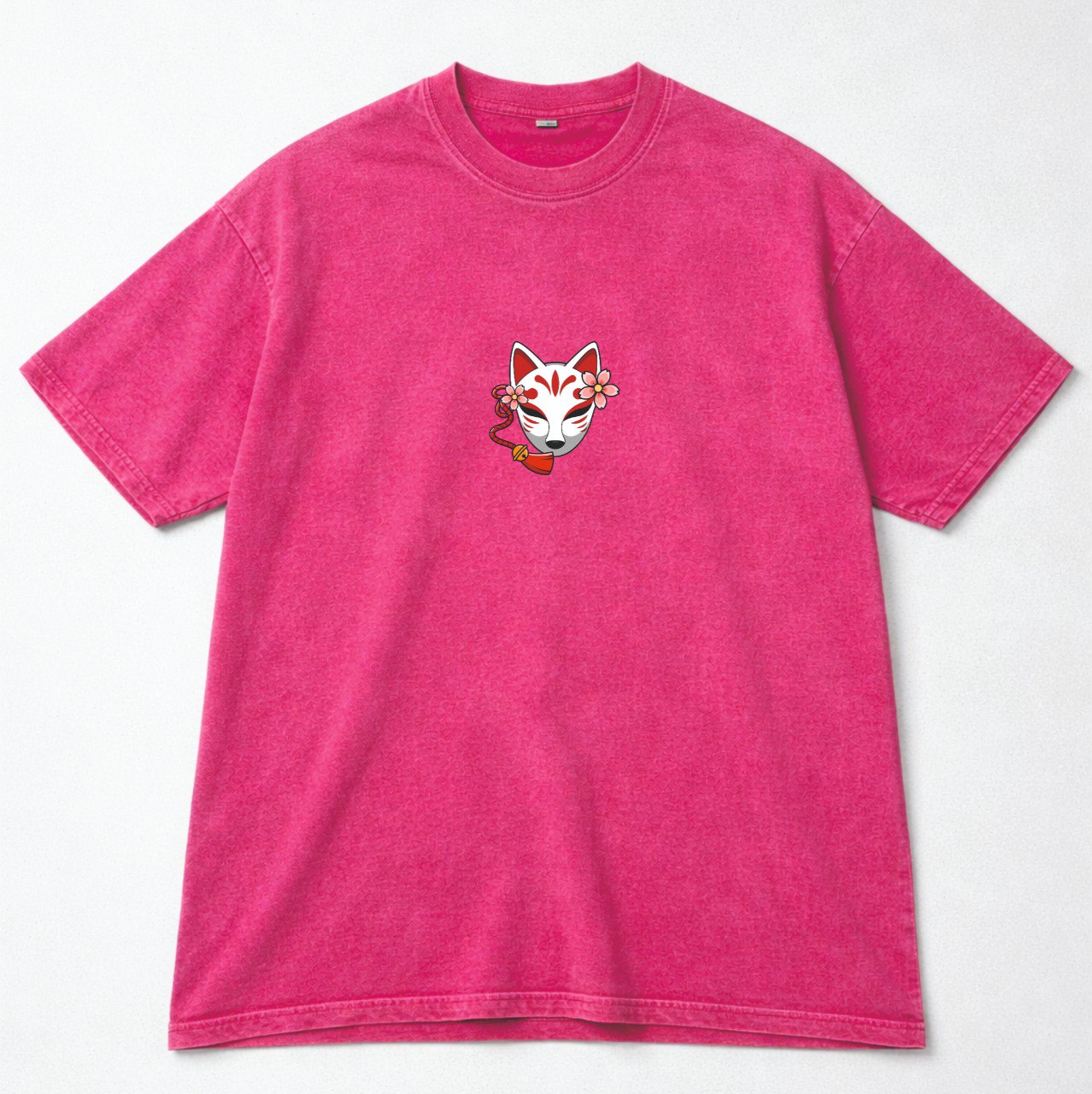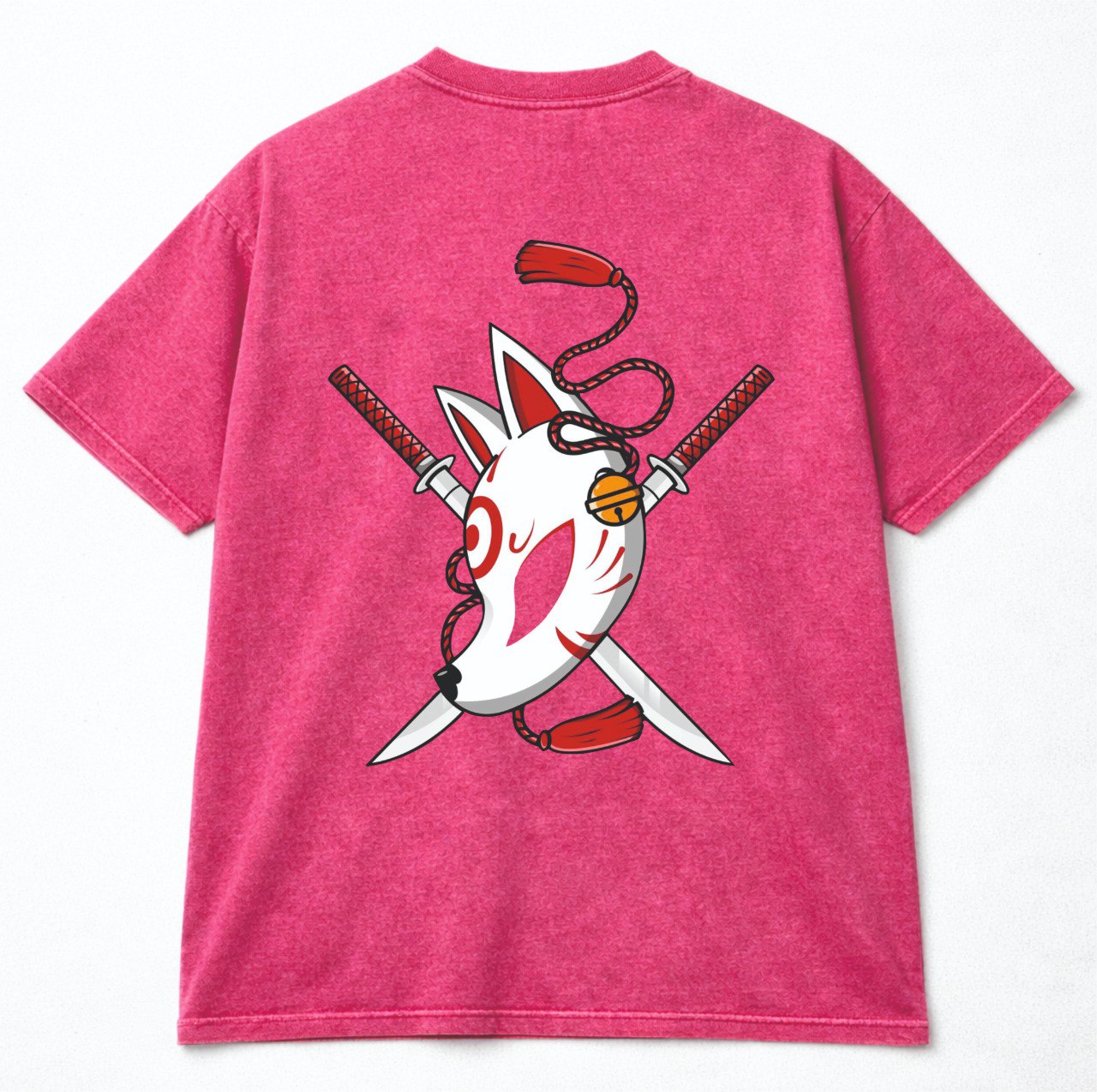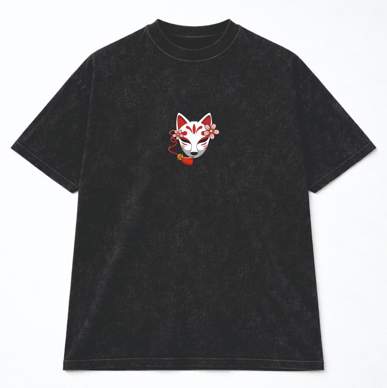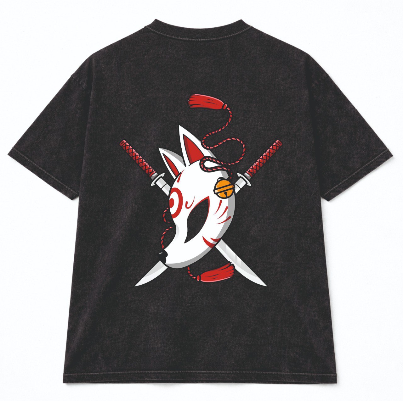 На грудях — мінімалістична маска Kitsune з сакурою, на спині — великий акцентний принт із маскою, катанами та червоними деталями.